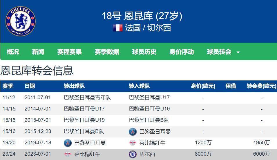 恩昆库原本是巴黎圣日耳曼青训系统的优秀培育,2019年夏季转会窗中以1950万欧元的价格加盟莱比锡。在转会至莱比锡的四个赛季里,他在各项赛事中一共出战172场,打入70球并贡献56次助攻,在2022-23赛季以25场德甲比赛中的16球4助,夺得了德甲金靴。随即,他以6000万欧元的转会费于2023年夏窗加入切尔西,彼时他的市场估值曾高达8000万欧元。然而,在切尔西的历程中,恩昆库似乎并未能紧跟英超快节奏和强对抗的风格,至今在各项赛事中出场61次的他仅斩获18球5助。